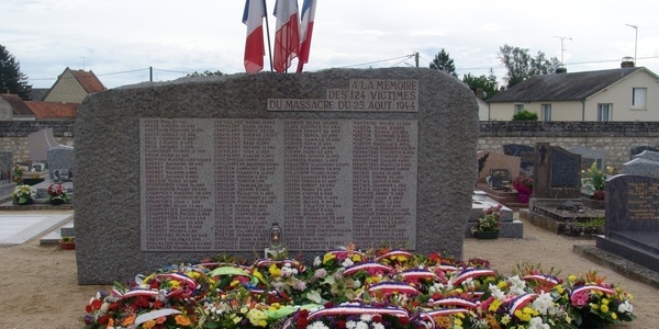 Nur wenigen Dorfbewohnern gelang es sich zwischen den Leichen tot zu stellen, da diese mit Phosphor-Brandsätzen versehen wurden.2 Erst um die Mittagszeit wurde das Gemetzel beendet. Die deutschen Truppen zogen sich zurück und hinterließen drei Zettel mit der Warnung (in fehlerhaftem französisch): "C´ est la punission des terroristes et leurs assistents" ("Das ist die Bestrafung der Terroristen und ihrer Helfershelfer"). Damit war die "Strafaktion" aber noch nicht beendet und der faschistische Vernichtungswille noch nicht vollends befriedigt. Gegen 14 Uhr begann die Beschießung des Ortes mit einem Flak-Geschütz, das auf einer 1500 Meter entfernten Hochebene in Stellung gebracht wurde und alle Häuser anvisierte, die noch nicht in Brand geraten waren. Das zweite Geschütz konnte nicht mehr eingesetzt werden, da es bereits von britischen Kampfflugzeugen außer Gefecht gesetzt worden war.
