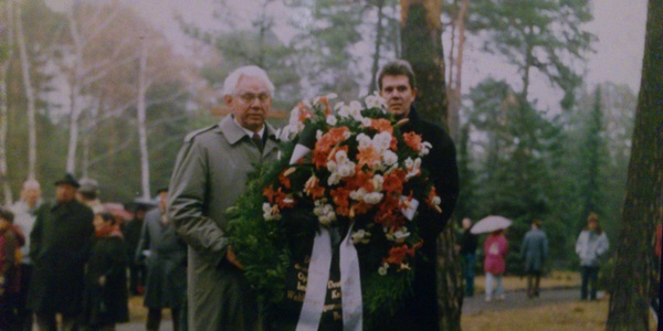 Hans-Jörg Rückert junior (rechts) und senior bei einer gemeinsamen Kranzniederlegung anläßlich eines Neonaziaufmarsches 1991 in Halbe.