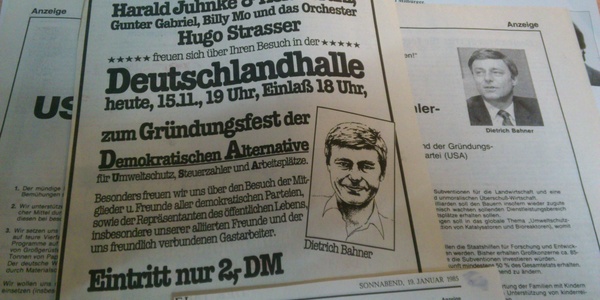 Der 1939 geborene Dietrich Bahner Junior war zunächst Mitglied der CDU, in der er es immerhin bis zum Bezirksvorsitzenden in Berlin-Wedding und Mitglied im Bundestag brachte. Nach einigem Parteigezänk, bei dem seine ins Gerede gekommenen Altenheim-Geschäfte eine Rolle spielten, trat er 1984 aus der CDU aus. Nachdem er sich für einiges Geld ein Gutachten über mögliches Wählerpotential beim Wickert-Institut eingeholt hatte, startete er noch 1984 im Alleingang den Aufbau einer neuen Partei, mit der er nationalistische und grünbürgerliche Wählerstimmen gewinnen wollte. Die Partei „Demokratische Alternative“ (DA), mit dem Beinamen „USA“ (für Umweltschutz, Steuerzahler, Arbeitsplätze) trat im März 1985 zu den Berliner Abgeordnetenhauswahlen an und erhielt auf Anhieb 1,3 Prozent der Stimmen. Einige Stellen aus den Wahlschwerpunkten der DA vom Januar 1985: „Sofortige und schärfste Maßnahmen zur wirkungsvollen Bekämpfung des Schein- und Wirtschaftsasylantenunwesens in Berlin“, „Schrittweisen Abbau des Ausländeranteils, insbesondere der Nichtintegrationswilligen'“ oder „Konsequenten Ausbau der Deutschland- und Berlinpolitik“ und „Die deutsche Frage ist nicht nur offen, sondern muß auch wieder Thema der internationalen Politik werden“.