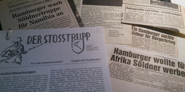 Bereits im Februar 1981 war Horst Klenz in Hamburg einschlägig aufgefallen. So veröffentlichte er im Wiener Neonaziblatt "Der Stoßtrupp" von Martin Neidthart einen Beitrag, um für Unterstüzung für weiße Farmer in Namibia ("Südwest") zu werben.7 In einem anderen Beitrag hatte er "kräftige Burschen" für eine "Mannschaft für Südwest" gesucht8 . Als er wegen dem Werben von Söldnern von der Polizei aufgesucht wurde fanden die Ermittler an seinem Arbeitsplatz Söldnerakten und 1.000 Patronen. In seiner Niendorfer Wohnung wurde eine Maschinenpistole sichergestellt.