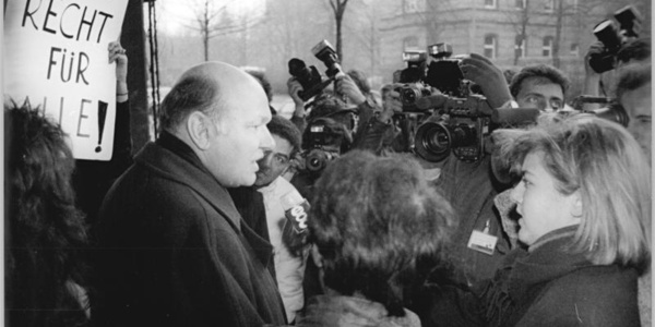 Der SPD-Bürgermeister Walter Momper diskutiert vor seinem Wahllokal in Berlin-Kreuzberg mit DemonstrantInnen für das kommunale Ausländerwahlrecht.