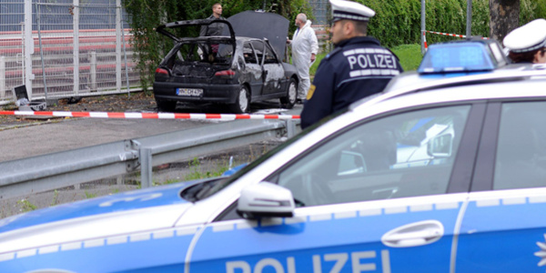 Der ausgebrannte PKW von Florian H. auf dem Vorplatz des Cannstatter Wasen