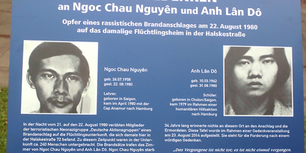 Die Halskestraße in Hamburg-Billwerder ist eine schmucklose Straße zwischen Autobahn, Gewerbegebiet und Rangierbahnhof am Rande der Stadt. Vor einem Hotel versammeln sich am 23. August 2014 ca. 60 Menschen. Sie gedenken der Opfer eines rassistischen Brandanschlags, der vor 34 Jahren in der Nacht zum 22. August 1980 von zwei Mitgliedern der neonazistischen „Deutschen Aktionsgruppen“ (DA) verübt wurde. Die DA wurden Anfang 1980 von dem Alt- und Neonazi Manfred Roeder gegründet und bestanden in ihrem Kern aus Sibylle Vorderbrügge, Heinz Colditz und Raymund Hörnle. Damals war das heutige Hotel eine Sammelunterkunft, in der vor allem sogenannte Boat People, Flüchtlinge aus Vietnam, lebten. Bei dem Brandanschlag starben die zwei jungen Vietnamesen Ngoc Chau Nguyên und Anh Lân Dô. An die Wand des Wohnheims sprühten die Täter_innen Vorderbrügge und Colditz „Ausländer raus“. Den Ort hatten sie nach einem Artikel im Hamburger Abendblatt ausgewählt, der von dort untergebrachten Flüchtlingen berichtete. Einige Tage später wurden die Kerngruppe sowie zwei weitere Personen festgenommen. 1980 erregte der Brandanschlag die hanseatische Öffentlichkeit noch. Die beiden Ermordeten erhielten ein feierliches Begräbnis mit 400 Trauergästen unter Beteiligung des damaligen Bürgermeisters Klose. Danach geriet der Brandanschlag schnell in Vergessenheit. Mittlerweile sind die Gräber von Ngoc Chau Nguyên und Anh Lân Dô aufgelöst. Nirgendwo in der Stadt wird der Opfer gedacht.