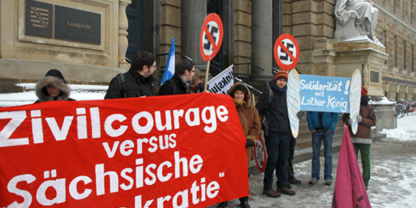 Im August 2011 durchsuchte die sächsische Polizei die Amts- und Wohnräume des Pfarrers Lothar König in der Jungen Gemeinde Jena und beschlagnahmte unter anderem deren Lautsprecherwagen. Die Staatsanwaltschaft Jena warf dem Pfarrer, der sich schon in den 1990er Jahren gegen die späteren Mitglieder des NSU engagiert hatte, u. a. aufwieglerischen Landfriedensbruch am 19. Februar 2011 vor. Weitere Verfahren der sächsischen Justiz folgten, u. a. gegen Tim H. und den Geschäftsführer der Berliner Vereinigung der Verfolgten des Naziregimes – Bund der AntifaschistInnen (VVN-BdA), Markus Tervooren, denen jeweils Landfriedensbruch vorgeworfen wurde. Die Liste ließe sich lange fortsetzen.