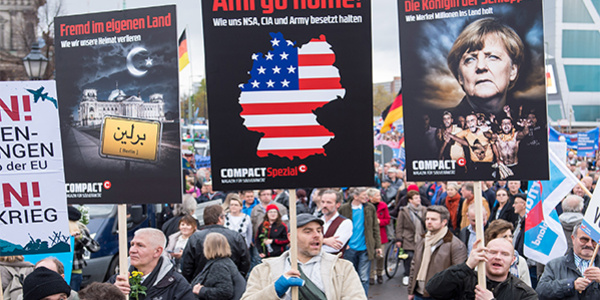 Neurechte AkteurInnen, die bisher vor allem in ihren eigenen publizistischen Kreisen aktiv waren, sind nun auch bei Demonstrationen zugegen und bringen ihre Deutungen eines drohenden Bürgerkrieges unter die Leute. Ein prominentes Beispiel dafür ist Götz Kubitschek, der sowohl bei LEGIDA in Leipzig als auch bei PEGIDA in Dresden mehrere Reden gehalten hat und mehrfach zusammen mit Elsässer Veranstaltungen durchführte. Relativ neue Akteurin im Bündnis ist die AfD, die nach dem Essener Parteitag im Juli 2015 und dem Austritt eines Teils des nationalliberalen Flügels nun auch auf die Straße drängt. Neben den wöchentlichen Demonstrationen in Erfurt mit rund 8.000 Teilnehmenden konnte die AfD auch bei Demonstrationen in Magdeburg und Berlin mehrere tausend AnhängerInnen mobilisieren. In vielen weiteren Städten fanden in den vergangenen Wochen Kundgebungen und Demonstrationen mit mehreren hundert Teilnehmenden statt. Die gegenseitige Bezugnahme der jeweiligen AkteurInnen ist dabei kaum zu übersehen. So nahm an der diesjährigen Compact-Konferenz in Berlin auch der Vorsitzende der AfD in Sachsen-Anhalt, André Poggenburg, auf dem Podium Platz.