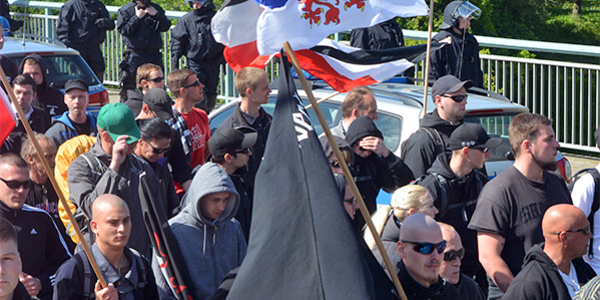 Die rassistischen Brandstifter Thomas Hocke (links mit Sonnenbrille) und Florian Hillner (mitte mit grauer Kapuze) bei einer NPD-Demonstration am 1. Mai 2014 in Rostock.