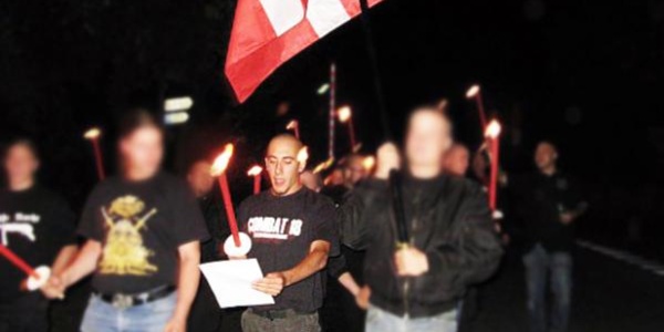 Der Schweizer Neonazi Kim Sury mit "Combat 18"-T-Shirt bei einer Demonstration.