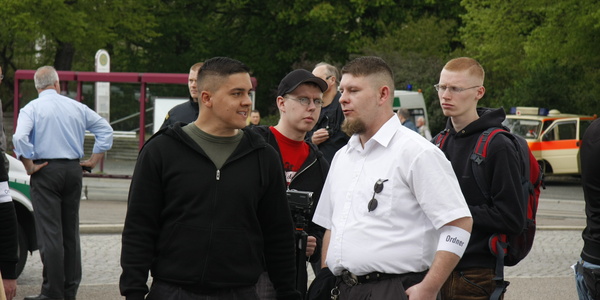 Tony Gerber (weißes Hemd) als Ordner auf einem von NPD und "Nationalen Sozialisten Zwickau" organisierten Aufmarsch am 1. Mai 2010 in Zwickau. Der frühere Bekannte von André Eminger ist heute ein regionaler Leiter der "Identitären Bewegung" in Sachsen.