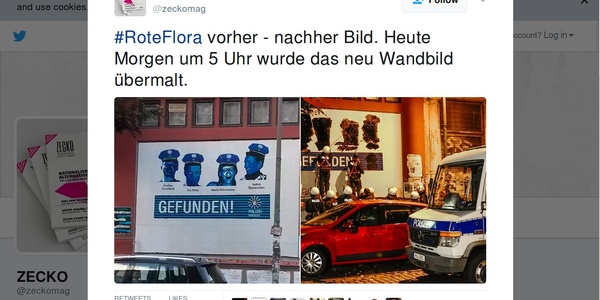 Gegen den rechtswidrigen Einsatz von verdeckten ErmittlerInnen richtete sich ein Plakat an der Roten Flora in Hamburg bis es von Polizeikräften unkenntlich gemacht wurde.
