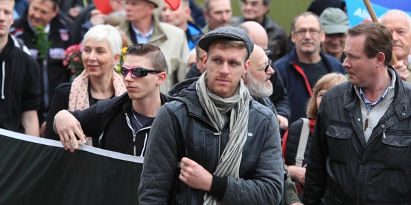 Dennis Wilsky (mit Sonnenbrille) und der ehemalige NPD-Funktionär Maik Schneider (mit Mütze) bei einer AfD-Demonstration am 7. November 2015 in Berlin.