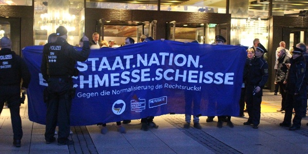 Das Bündnis „Buchmesse gegen Rechts“ und die Gruppe „Prisma“ führten eine „Show für die Meinungsfreiheit“ neben der Lesebühne durch, auf der der rechte Verleger Götz Kubitschek wenig später seinen Vortrag halten sollte. Nach dem Ende dieser spontanen Kundgebung verließen deren Teilnehmer_innen geschlossen das Messegelände. Als Kubitschek mit seinem Vortrag anfing, begannen einige Aktivist_innen diesen mit Parolen und einem Transparent zu stören. Mitglieder der rechten Gruppierung „Identitären Bewegung“ (IB) drängten die Aktivist_innen aus der Lesebühne. Spontan entfaltete sich der Protest von circa 60 anwesenden Antifaschist_innen mit Parolen, welche die Lesung störten. Entgegen der von Kubitschek ausgegebenen Anweisung, nicht mit dem Rufen rechter Parolen auf Proteste zu antworten, kamen Sprüche wie „Jeder hasst die Antifa“ und „Pro Border, Pro Nation – Stop Immigration“. Das Medienecho im Nachgang war wenig überraschend. Die Ereignisse wurden zu „Tumulten“ überinterpretiert, die bürgerlichen Medien warfen „der Antifa“ vor, die Lage eskaliert zu haben.