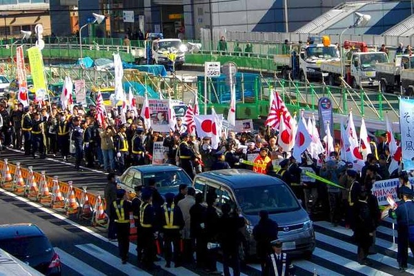 Es verwundert daher nicht, dass in einem solchen Klima auch die außerparlamentarische Rechte an Zulauf gewinnt. Schon seit Jahrzehnten gibt es hunderte extrem rechter Kleinstgruppen, die mit ihrem Auftreten in Fantasieuniformen und den Verbindungen zur Yakuza, der japanischen Mafia, nur allzu oft als Parodie ihrer selbst angesehen werden. Weitaus einflussreicher und agiler ist da die „Bürgerbewegung gegen die Sonderrechte der koreanischen Minderheit“, international besser bekannt unter dem japanischen Kürzel „Zaitokukai“. Im Jahr 2007 aus der Gruppe „Konservativismus in Aktion“ hervorgegangen, agitierte die Zaitokukai anfangs gegen Gesetze zum Schutz der koreanischen Minderheit, welche in ihren Augen Privilegien und Sozialbetrug darstellen. Im Laufe der Zeit wurden auch Illegalisierte und Linke zu Angriffszielen. Japanweites Aufsehen erregten etwa Zaitokukai-Kundgebungen vor koreanischen Minderheitenschulen, wobei die Schüler_innen als Kakerlaken beschimpft und ihnen der Tod gewünscht wurde. Was die Zaitokukai von anderen neofaschistischen Kleinstgruppen unterscheidet, ist ihre relativ professionelle Internetpräsenz. Der Gründer, Makoto Sakurai, war schon Anfang der 2000er Jahre eine Internetprominenz in einem der größten japanischen Internetforen („2channel“), wo er als extrem rechter Kampf-Poster auffiel und daraufhin sogar zu Talkshows im japanischen und koreanischen(!) Privatfernsehen eingeladen wurde.