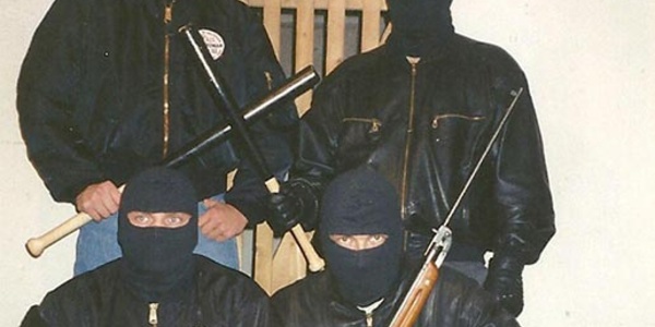 Die Vertrauten des NSU Jan Botho Werner und Polizeiinformant Thomas Starke posieren Ende der 1990er Jahre mit weiteren bewaffneten Neonazis.