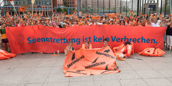 Die SEEBRÜCKE ist eine deutschlandweit und inzwischen auch international aktive Bewegung, die von verschiedenen Privatpersonen sowie Initiativen und Organisationen der Zivilgesellschaft getragen wird. Die Bewegung steht für Solidarität mit Geflüchteten und den Seenotretter_innen auf dem Mittelmeer. Die Farbe der Bewegung ist Orange – die Farbe der Rettungswesten. Die Forderungen der SEEBRÜCKE sind sichere Fluchtwege und –häfen, die Entkriminalisierung der Seenotrettung und eine menschenwürdige Asylpolitik in Europa – also kurz: die Bewegungsfreiheit für alle Menschen unabhängig davon, wo sie herkommen oder wo sie hinwollen. Damit positioniert sich die Bewegung bewusst als Gegenpol zu den immer deutlicher werdenden nationalistischen Abschottungstendenzen in Europa und der Ausbreitung von rechtem Gedankengut.