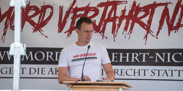 Der Vorsitzende der NPD-Jugendorganisation Christian Häger als Redner in Berlin.