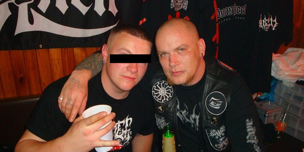 Christian Schöndorfer (rechts), Geschäftspartner von Hendrik Möbus, am Verkaufsstand von „Merchant of Death/Darker Than Black“ vor wenigen Jahren. Im Hintergrund ein T-Shirt mit dem Symbol der SS-Division „Totenkopf“.