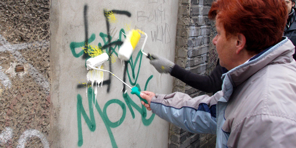Die damalige Bezirksbürgermeisterin beim Übermalen eines Hakenkreuzes.