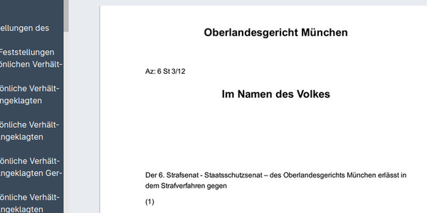 Arne Semsrott (FragDenStaat.de) (Gastbeitrag)Vor zwei Jahren endete vor dem Oberlandesgericht München der erste NSU-Prozess mit Urteilen „im Namen des Volkes“ gegen Beate Zschäpe und weitere Angeklagte im Umfeld der Neonazi-Terrorgruppe NSU. Kaum ein Prozess in der Geschichte der Bundesrepublik Deutschland wurde aus der Zivilgesellschaft derart aufmerksam verfolgt - und kaum ein Urteil wurde derart stark kritisiert. Das liegt nicht nur an den als äußerst mild bemängelten Urteilen gegen manche Angeklagte, denen Verbindungen zum Mord an zehn Menschen und weiteren Attentaten nachgewiesen wurden. Auch die schriftliche Urteilsbegründung, die nach zwei Jahren Gerichtsarbeit im April 2020 an Prozessbeteiligte verschickt wurde, fand große Beachtung. Ende Juni 2020 veröffentlichten „FragDenStaat“ und NSU Watch gemeinsam erstmals das schriftliche Urteil des Münchner Oberlandesgerichts, um eine breite öffentliche Diskussion darüber zu ermöglichen. Damit stehen die 3 025 Seiten der Urteilsbegründung unter fragdenstaat.de/nsu-urteil der Öffentlichkeit nunmehr durchsuch- und navigierbar zur Verfügung. Sie können zudem als PDF- und HTML-Datei heruntergeladen werden.
