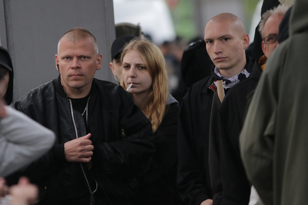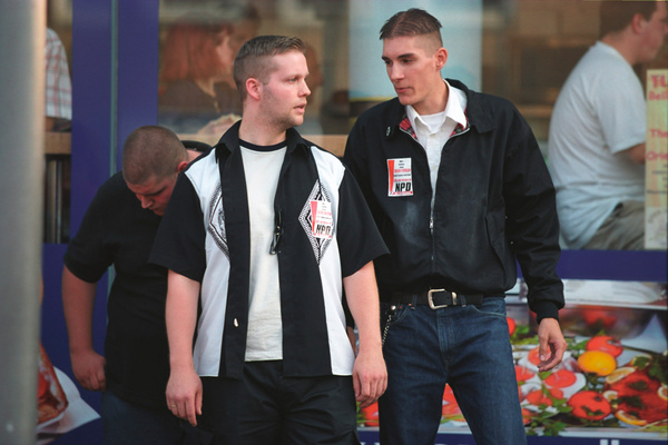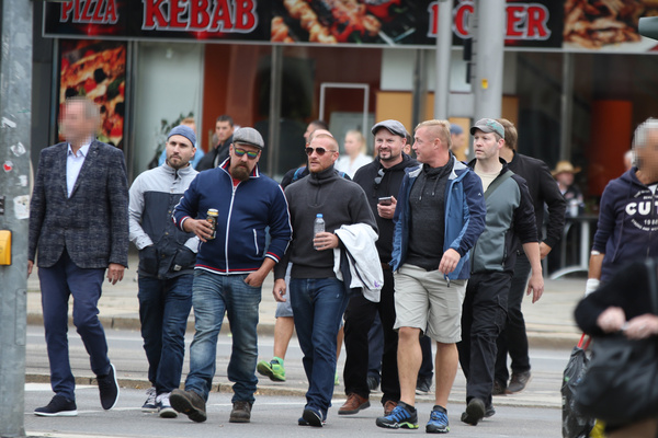 Am 17. August 2002 posierte Stephan Ernst (mittig) mit schwedischen Neonazis beim neonazistischen „Rudolf Heß-Gedenkmarsch“ in Wunsiedel.