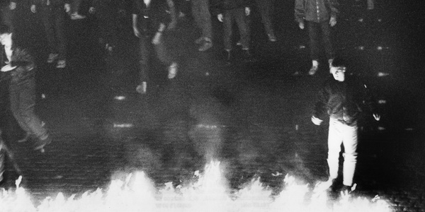 Neonazis während des Angriffs auf das besetzte Haus in Weimar am 3. Oktober 1990. Die Straße brennt von ihren eigenen Molotow-Cocktails.