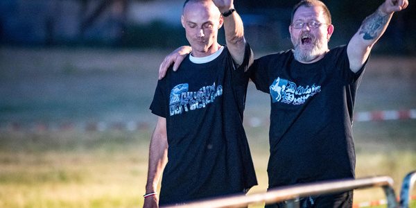 Die Bundeswehr-Reservisten Michael Reinert (links) und Heinz Kriegel (rechts) beim neonazistischen „Tag der nationalen Bewegung“ in Themar im Juni 2018.