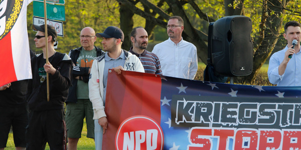 Marcus Bischoff (mitte im gestreiften Hemd) neben dem Berliner NPD-Chef Andreas Käfer (rechts daneben) und dem NPD-Vorsitzenden Frank Franz (Redner) bei einer Kundgebung in Berlin am Kanzleramt am 18. April 2018.