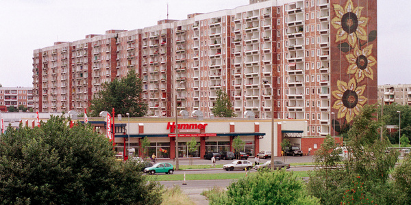 Das sogenannte Sonnenblumenhaus in Rostock-Lichtenhagen. Im August 1992 wurde das Wohnheim für vietnamesische Vertragsarbeiter*innen tagelang von einem rassistischen Mob belagert und angegriffen.