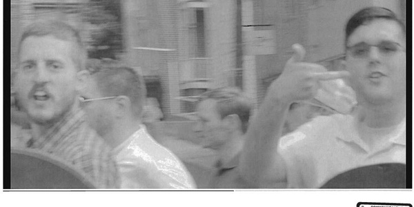 Dieses Foto diente als Beweismittel der Anklage und zeigt James Alex Fields (rechts) mit einem Schild währen der nationalistischen Versammlung in Charlottesville am 12. August 2017.