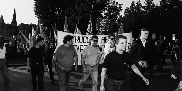 Der Neonazi-Funktionär Michael Petri (links mit Funkgerät) beim Rudolf Hess Marsch 1993 in Fulda.
