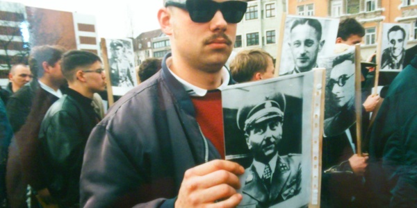 Ein Neonazi hält ein Foto des "Reichsführers der SS" Heinrich Himmler auf einer Neonazi-Demonstration in München.