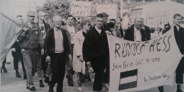 Im Demonstrationszug FAP-Chef Friedhelm Busse und die ehemalige »Verlobte« des verstorbenen Neonazi-Führers Michael Kühnen Esther Wollschläger („Lisa“) von der „Deutsche Frauenfront“ (DFF), die symbolisch eine Urne vor sich her trug1 . Mit dabei auch der obligatorische Trommlerzug der FAP. Redebeiträge wurden unter anderem von dem Alt-Nazi Otto Riehs, von dem Neonazi-Funktionär Wolfgang Juchem und Michel Faci („Michael Leloup“) gehalten. Michel Faci berichtete über seinen Kampfeinsatz im ehemaligen Jugoslawien und rief dazu auf, den Kommunismus in Kroatien zu zerschlagen. Danach löste sich die Versammlung unbehelligt von den »Ordnungskräften«, die inzwischen nicht wesentlich mehr geworden waren, auf.