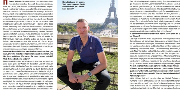 Aber später kam eszum Bruch zwischen Kühnen und Althans. Althans gibt ideologische Gründe an: Er habe am Hitlerismus festhalten wollen, Kühnen hingegen eine, eher an der SA orientierte, »nationalrevolutionäre« Linie angesteuert. Mitte der 1980er, während Kühnen im Gefängnis saß, sah es tatsächlich so aus, als würden sich seine Gegner innerhalb des militanten Neonazilagers durchsetzen. Es scheint also, als würde Althans ideologische Gründe vorschieben, wo er aus Opportunismus einen »Kameraden« verriet. Der Streit innerhalb der ANS-Nachfolge-Organisation FAP, die Intrige des Anti-Kühnen-Flügels wurde seinerzeit aufgehängt an einer Schrift zum Thema Homosexualität, die Kühnen, mittlerweile in Haft, verfasst hatte. Althans hat vor kurzem, nachdem ihn beherzte Schwule antifaschistischer Gesinnung in einer Discothek angegriffen hatten, seine eigene Homosexualität in einem Brief an die Szene-Zeitschrift »Don&Adonis Magazin« offen gemacht. Dieser Brief hinterlässt den Eindruck, das der „große Neonazi-Organisator“ in einer Krise steckt, seit er sein Ziel - Popularität - erreicht hat. Aber Althans Sexualität und Lebensweise interessiert uns hier nur insoweit, als sie ihn in keiner Weise davon abhielt, sich dem erklärt schwulenfeindlichen Anti-Kühnen- Flügel in der FAP anzuschließen, scheinbar weil er sich nicht vorstellen konnte, daß Kühnen sich nochmal durchsetzen könne. Althans hat wiederholt darauf hingewiesen, daß die Trennung von Kühnen im Rahmen dieses Streites zustande kam und sich ausdrücklich auf Kühnens Homosexualität bezog.2 Althans hinterlässt den Eindruck, daß er alle zwei bis vier Jahre die Neonazi-Struktur wechselt. Es bleibt abzuwarten, auf welchen Zug er als nächstes aufspringt. Letztlich verließ der Trittbrettfahrer dieses Spektrum vorläufig weitestgehend.