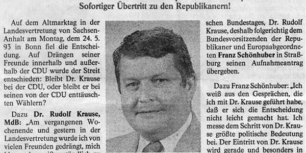 Erste positive Ergebnisse (Risse im Informationsfluß zwischen Vorstand und Basis) sind schon erkennbar. Der aus der Partei 1993 ausgetretene ehemalige Landesvorsitzende von Sachsen-Anhalt Ekkehard Birkholz beklagte den autoritären Führungsstil der „Ein-Mann-Partei“. Bei den am 12. Juni 1994 stattgefundenen Wahlen der Abgeordneten des europäischen Parlaments traten zehn REP-Kandidaten auf einer gemeinsamen Liste für alle Länder an. Aus Sachsen-Anhalt kandidierten Rudolf Krause aus Bonese auf Listenplatz zwei und Marita Schwarze aus Jessen auf Listenplatz zehn. Die REP haben in Sachsen-Anhalt einen Landesverband und mehrere Kreisverbände aufgebaut. Als Landesvorsitzender fungierte zunächst Ekkehard Birkholz aus Frose (Landkreis Aschersleben). Nach dessen Rücktritt übernahm die Bundesschriftführerin Martina Rosenberger (Bayern) kommissarisch. Durch Partei-Übertritte sind Rudolf Krause (Bonese) sowie der in der Quedlinburger Stadtverordnetenversammlung und im Kreistag vertretene Heinz-Otto Hohmann zu REP-Mandatsträger geworden.) Magdeburger AntifaschistInnen hoffen, daß es ihnen auch in Zukunft gelingt, die Arbeit der ultra-rechten Parteien zu erschweren und Treffen in Magdeburg zu einem Risiko für solche Organisationen zu machen.
