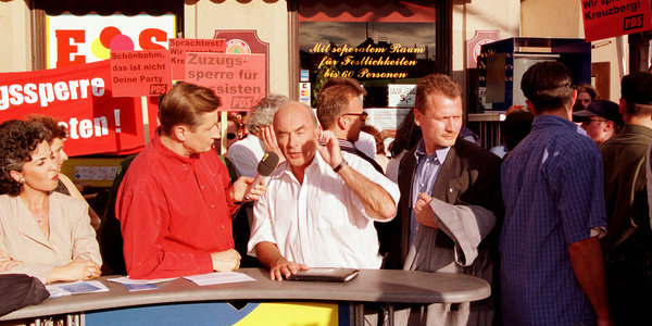 Jörg Schönbohm (Bildmitte) versucht auf einem Kreuzberger Wochenmarkt dem Berliner Fernsehsender SFB seine Positionen zu erklären.