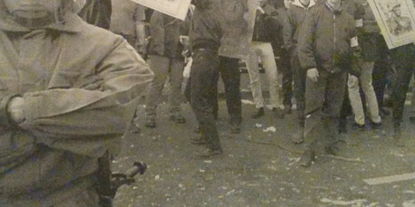 Sie hatten es schon auf den ersten Metern nicht leicht. Einerseits schafften es die »Kameraden« nicht so richtig, in Reih und Glied zu gehen, andererseits gab es von Beginn an direkten Kontakt mit GegnerInnen des Aufmarsches, die bis auf wenige Meter an die Neonazis herangekommen waren. Doch jetzt begannen die am Rande stehenden Menschen, die »deutschen Recken« mit allem einzudecken, was der Gemischtwarenladen an der Ecke so hergab. Viele Ladeninhaber verschenkten ihre Auslagen an Demonstrantnnen, auf viel Kundschaft konnten sie wegen der Vollsperrung der nördlichen Innenstadt ohnehin nicht mehr hoffen. Als die Eier in den Geschäften zur Neige gingen, holten einige LadeninhaberInnen sogar noch Nachschub aus ihren darüberliegenden Wohnungen. Nachdem im Viertel kein einziges Ei mehr aufzutreiben war, stieg mensch auf Joghurt, Apfelsinen, Quark, Mehl und zum Schluß sogar Broccoli um. Bei den Menschen am Rande handelte es sich zum großen Teil nicht um klassische (autonome) Antifas-AktivistInnen sondern um Kölner BürgerInnen allgemein, Vorstadtkids und MigrantInnen der dritten Generation. Dementsprechend tat sich die Polizei auch schwer, gegen diese Menschen gewohnt rigeros vorzugehen. Wenn sie konnte, nahm sie einen der mutmaßlichen EierwerferInnen fest und räumte Bereiche, wenn von dort Flaschen oder Steine flogen.