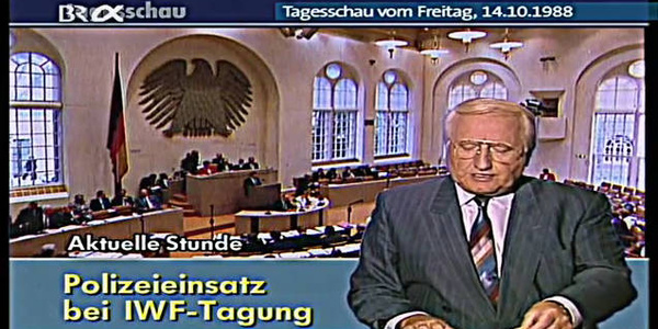 An Protesten gegen die Jahrestagung des Internationalen Währungsfonds (IWF) und der Weltbank im September 1988 in West-Berlin nahmen mehrere zehntausend Menschen teil. Diese bestanden aus einer Vielzahl von Stör- und Protestaktionen, zu denen bundesweit mobilisiert worden war, und waren in eine mehrjährige Kampagne eingebettet. Höhepunkte waren eine zentrale Großdemonstration mit 80.000 Teilnehmern und ein Gegenkongress am Wochenende zuvor. Während der ganzen Aktionstage kam es in der Nähe von Kundgebungen und Aktionen immer wieder zu Übergriffen und Angriffen von Neonazis. Die folgenden geschilderten Vorfälle sind sicher nicht umfassend. Falls ihr weitere Informationen habt, laßt sie uns zukommen.