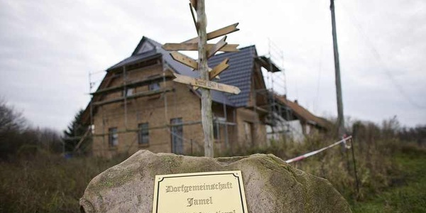 Jamel, 22.11.2010 Ein Wegweiser in dem kleinen Dorf weist den Weg u. a. nach "Wien/Ostmark" und nach Braunau am Inn, dem Geburtsort von Adolf Hitler. Unter dem Wegweiser befindet sich ein Findling auf dem eine Tafel mit der Aufschrift "Dorfgemeinschaft Jamel frei - sozial - national" angebracht ist.
