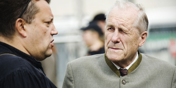 Der Referent Herbert Schweiger (rechts) im Gespräch mit dem Österreicher Neonazifunktionär Gottfried Küssel (links) auf einer Neonazi-Demonstration in Deutschland.