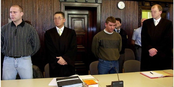Die Angeklagten Ronny Sanne (links) und Andre Bohs (3.v.l.) mit ihren Anwälten im November 2001 vor Gericht.