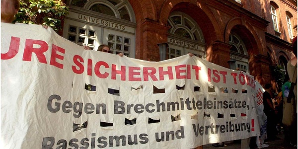 In den vorhergehenden Monaten wurde diese Maßnahme häufiger angewandt. Der heftigen, nicht zuletzt auch aus der ÄrztInnenschaft angeführten Kritik zum Trotz, machte Püschel umgehend deutlich, wie er mit dem »tragischen Ereignis« umzugehen gedenkt. Zwar fände auch er den Job »zum Kotzen«, aber von einer Einstellung dieser Methode an seinem Institut will er nichts wissen und legt seitdem höchstpersönlich Hand mit an. In der Praxis stellt sich die Einflößung von Brechmitteln, die bislang nur in Hamburg, Hessen, Nordrhein-Westfalen und Berlin4 im »Kampf gegen die Drogenkriminalität« angewandt wurde, als eine rassistische Schikane gegen zumeist schwarze Flüchtlinge dar. Seit Jahrzehnten wird sowohl von KriminologInnen als auch von MitarbeiterInnen der Drogenhilfeeinrichtungen vergebens darauf hingewiesen, dass für die Verelendung und die konstant hohe Zahl von Drogentoten maßgeblich die Illegalisierung der entprechender Substanzen und das damit verbundene repressive Vorgehen verantwortlich sind.
