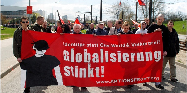 Exakt das selbe formulierte bereits 1920 die NSDAP in ihrem 25-Punkte-Programm, dem »Grundgesetz der nationalsozialistischen Bewegung schlechthin« (Michael Kühnen). Als Leitgedanken stellt die extreme Rechte der Globalisierung den Nationalismus entgegen. Ein »homogenes, einiges Volk« sei der größte Feind der transnationalen Konzernen. »Deshalb trachtet das internationale Grosskapital danach, durch Masseneinwanderung und ethnische Vermischungsprozesse homogene Völker nach Kräften aufzulösen.«3 Fast selbstverständlich sei, dass vor allem Menschen aus anderen Kulturkreisen (Osteuropa, arabischer Raum) einwandern. So kurz ist der Weg von Globalisierungskritik zu völkischem Rassismus. Und ausgelebt wird dieser unter dem Stichwort »Vielfalt der Völker erhalten« in allen (altbekannten) Facetten. So bezeichnet die NPD ihre Positionen als »Ethnopluralismus«, welcher vermeintlich das Selbstbestimmungsrecht der Völker forciere.4