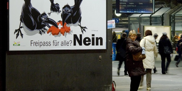 Werbeplakat der rechtspopulistischen Schweizer Volkspartei (SVP) gegen den Beitritt osteuropäischer Staaten zur Europäischen Union im Züricher Hauptbahnhof.