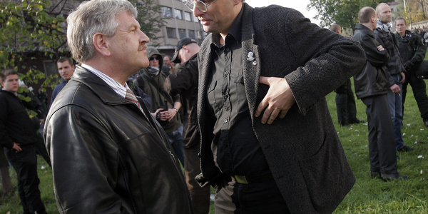 Uwe Meenen (rechts) löste den Szene Streit aus. Hier im Gespräch mit dem NPD-Chef Udo Voigt (links) im Oktober 2006 in Nürnberg.