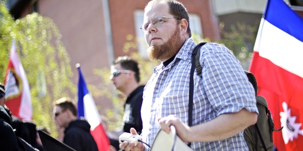 Jörn Lemke, Kreisvorsitzender der NPD Lübeck/Ostholstein, bei einem Demonstrationsversuch am 1. Mai 2012 in Neumünster.