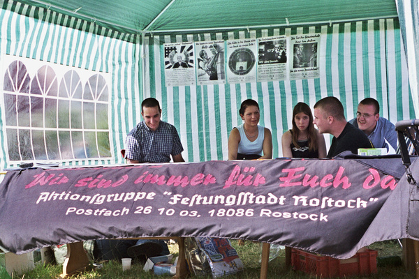 - 3Die Band um Martin K. aus Karlshagen veröffentlichte 1999 die CD »Heim ins Reich« und einen Beitrag auf dem indiziierten Sampler »Der Angriff beginnt« und trat u.a. beim Osterkonzert des KBA im Frühjahr 2002 auf.