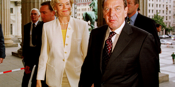 Feierlichkeit zum 50. Jahrestag der Charta der Deutschen Vertriebenen im Schauspielhaus in Berlin. Links Erika Steinbach, rechts Gerhard Schröder