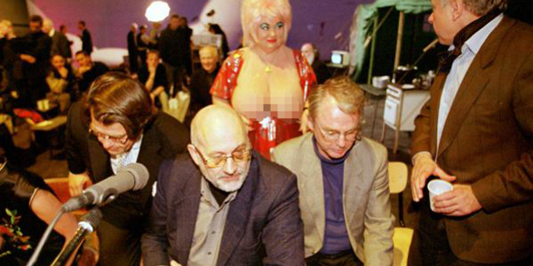 Jede Bühne ist ihm Recht – Horst Mahler (2.v.l.) und Prof. Michael Nier (2.v.r.) beim »2. Grossen Kameradschaftsabend mit Gästen aus Politik und Kultur«. In dem von Christoph Schlingensief 1999 an der Berliner Volksbühne inszenierten Stück diskutierten sie mit, laut Eigenbezeichnung, Berlins dickster Hure, Molly Luft.