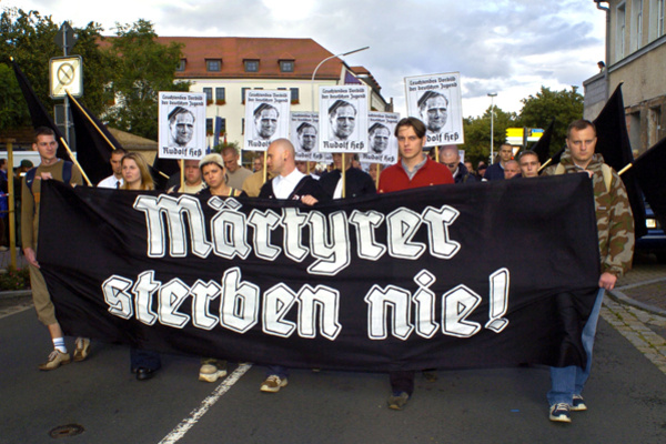 Am Vormittag des 21. August schien Wunsiedel, wie in den Jahren zuvor beim »Heß-Gedenkmarsch«, fest in der Hand von Neonazis. In einer Buchhandlung liegt die »National-Zeitung« mit der Schlagzeile »Rudolf Heß – war es Mord?« ganz oben auf dem Tresen, daneben die rechte Wochenzeitung Junge Freiheit. Drei zierliche alte Damen tragen Heß-Buttons an beigen Sommermänteln. »Das war unsere Zeit unter Hitler, der Rudolf Heß war so ein feiner Mensch,« schwärmt die Älteste des Trios von Heß, vor dem sie als Balletttänzerin auftrat und dessen Grab sie regelmäßig mit Blumen versorgt. Wunsiedeler Neonazi-WGs warten am Bahnhof auf »Kameraden aus Sachsen« – man kennt sich von Konzerten und Aufmärschen. Im Garten der »Sechs-Ämterland-Klause« posieren die »Veneto Fronte Skinheads« aus Italien fürs Erinnerungsfoto.