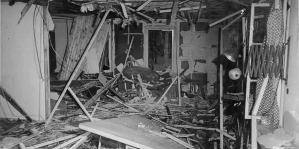 Hitler-Attentat am 20. Juli 1944. Führerhauptquartier "Wolfsschanze" bei Rastenburg: Inneres der zerstörten "Lager-Baracke"