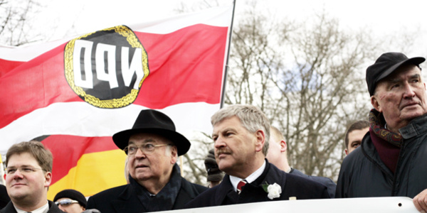 Auch am 13. Februar in Dresden: Holger Apfel, Gerhard Frey, Udo Voigt und Franz Schönhuber unter der Fahne der NPD